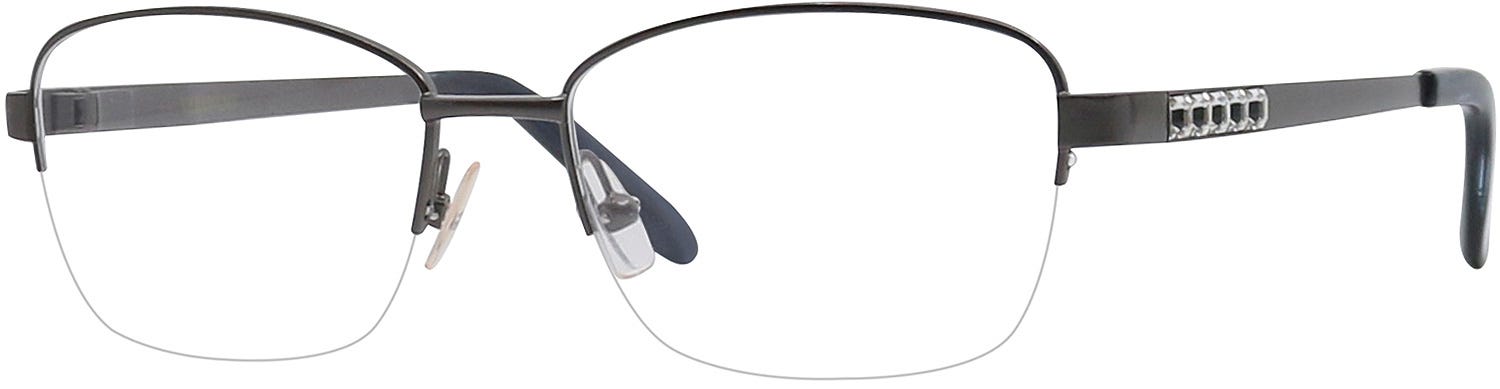 Lasya by Vera Wang are stylishly designed elegant looking rectangle frames with a sophisticated half rim design. These retro frames have a nice elegant appeal to them thanks to the sleek front design that has an enticing straight nose bridge and and the dainty temples on the sides that have intriguing rhinestones embedded on them. The classy gunmetal finish of these frames adds even more finesse to this classy look. These frames are lightweight and comfy thanks to their metal structure and the spring hinges. Add these glasses to your attire at the best prices with the promise of a pleasant customer experience. These glasses will come packaged in a lovely Goggles4U case.