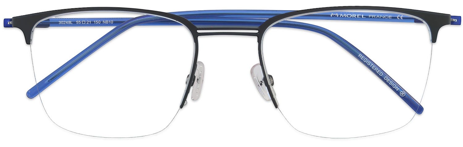 Morel France 30248L are highly alluring and elegantly styled rectangle frames with a classy half-rim design. The stylish rectangle lenses are beautifully complemented by a refined front featuring an enticing double nose bridge, seamlessly paired with sleek, slender temples on the sides. The chic black-blue finish enhances their eye-catching appeal, adding a polished touch to their contemporary look. Crafted from a lightweight combination of metal and TR-90 material, these frames also feature spring hinges to ensure a comfortable and pleasant fit. Purchase these glasses at the best prices with the promise of a quality customer experience. These glasses will come packaged in a lovely Goggles4U case.
